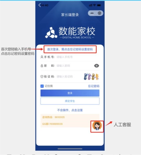 绑定:首次使用需要绑定学生,点击下方绑定学生(有多个小孩可以一次性绑定完成再登录,一个号码可以绑定多个学生,一个学生可以绑定多个号码);