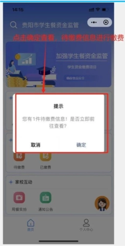 家长登录后,若有待缴费用,系统会弹出提示信息;点击“确定”按钮,即可跳转至待缴费页面,按提示完成缴费操作即可。(左侧为有待缴费的页面截图,右侧为无待缴费的正常页面截图)