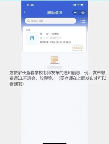 家长点击此处,即可随时查看学校老师发布的通知(仅能查看老师发布的内容)。