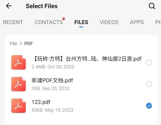 接下来在文件列表里挑选需要传送的文件,要是文件数量比较多,你可以先选定文件类别,再逐步查找。