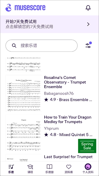 在【资料库】版块,你需要先完成登录操作,之后就能浏览到海量的曲目库,方便你进行轻松练习。