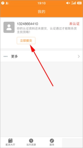 登录成功进入后,点击“我的”,能看到状态显示为“未认证”,接着点击“立即提交”。