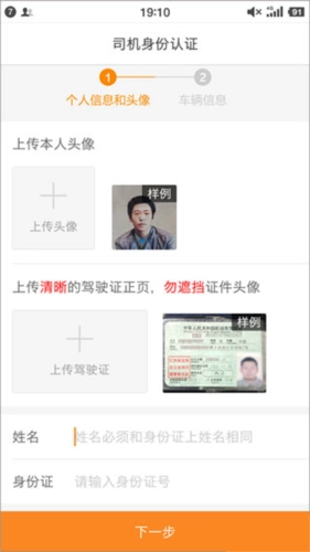 进入司机身份验证环节,需提交头像照片与驾驶证图片资料,并且填写姓名及身份证号。