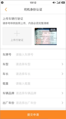 上传行驶证照片,填写车牌号、车型、车长、载重、车辆品牌、出厂年份等信息,然后提交申请。