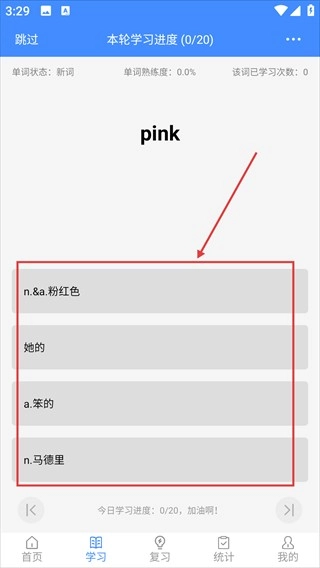 在学习页面,针对当前展示的单词,选择正确释义。