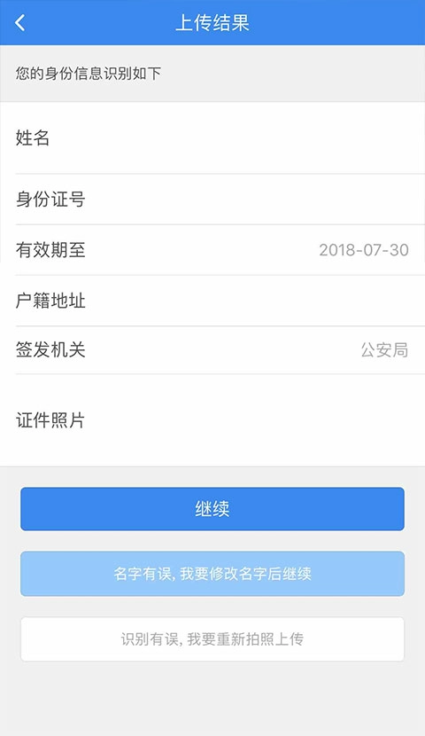 确认身份证信息无误之后点击“继续”。