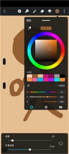 当油漆桶的容差值设置过低时,填充操作容易出现白边问题。您可以通过从右上角拖动颜色的方式来调整容差值,操作时请保持手指在画布上左右滑动:向右滑动会提高填充的容差范围。HiPaint会自动保存您设置的新容差值,并在您下次使用填充功能时直接应用该数值。
