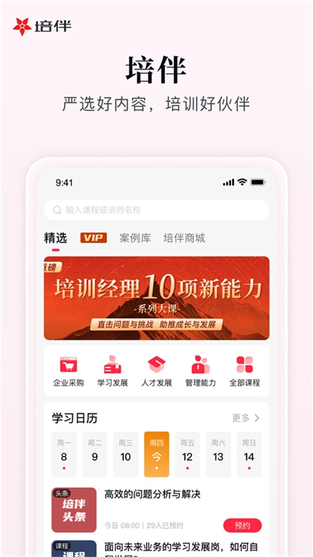 培伴App聚焦培训行业的八大细分领域,包括“培训管理、人才发展、内训师、人力资源、职场提升、团队管理、组织管理、业务能力”,旨在满足用户的系统化学习需求,并着力优化用户在在线学习、优质内容检索及资源匹配等功能上的使用体验。