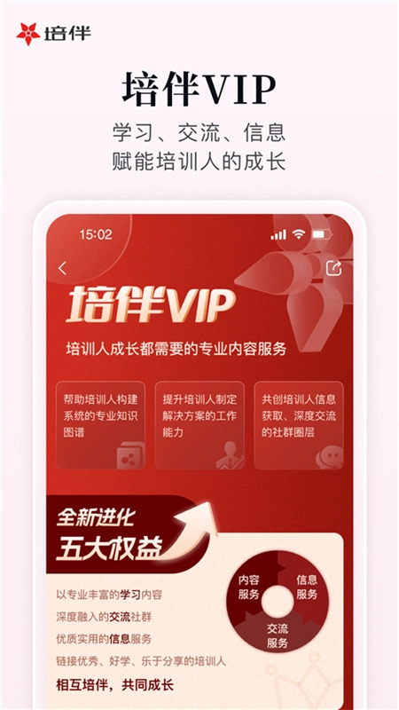 2026年,培伴VIP迎来全新升级。我们将从“学习服务、信息服务、交流服务”三大维度出发,搭配六大专属权益,助力培训人搭建系统的专业知识框架,增强其制定培训解决方案的核心能力,同时携手培训人共同打造一个高效获取信息、深度互动交流的专属社群圈层。