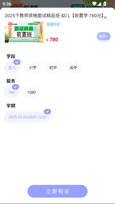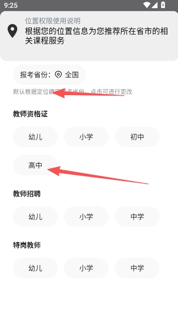 开启手机位置功能后,软件会依据你所在的省份,为你推送经过细化分类的相关课程服务,请按照以下条件进行筛选设置。