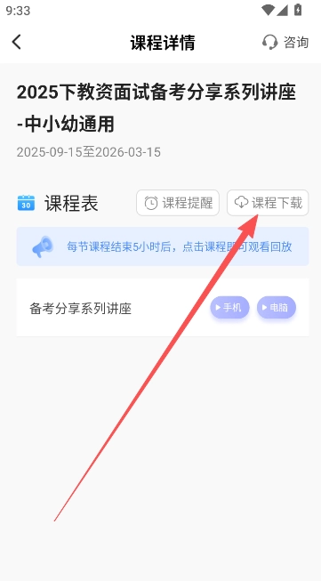同学您好,您可以通过手机端登录账号,进入“我的课程”板块,找到课程对应的课程表,点击课程后方的“电脑”图标。按照提示打开浏览器,并复制网址https://3min-class.offcn.mobi/live,然后使用手机界面的对话框扫描电脑端显示的二维码,就能马上开始听课学习啦(建议优先选择谷歌、360或火狐浏览器哦)。