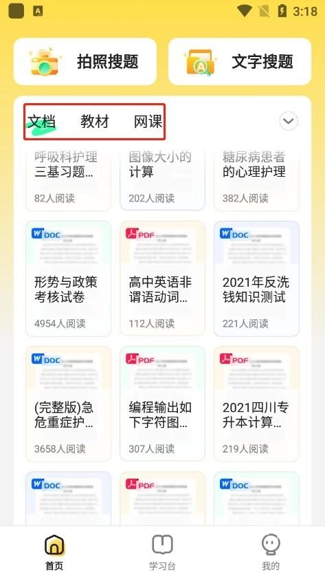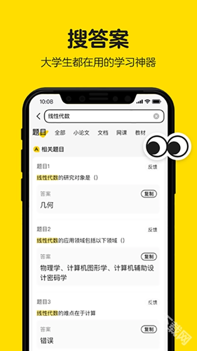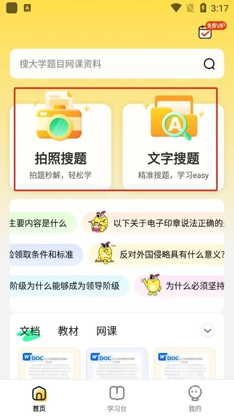 学习功能:可搜索各类问题、文档、课程及教材,汇聚大学全部学习资料,一键即可搜索所有内容!