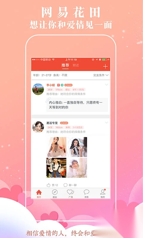 网易花田安卓版是网易推出的一款聊天交友应用,平台拥有三千万真实用户,不必担心找不到懂你的人。用户只需填写好个人资料与交友要求,系统就会根据需求匹配最合适的异性好友,快来体验吧!