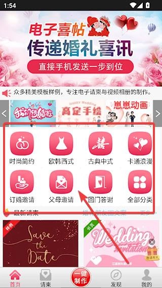 安装后点击进入婚礼请柬,首页提供了丰富的请柬风格