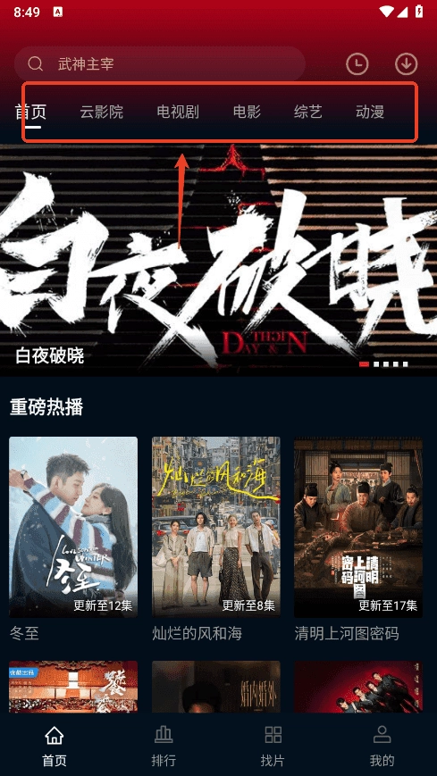 进入双鱼视频后,便能看到云影院、电视剧、电影、综艺、动漫这五大栏目。
