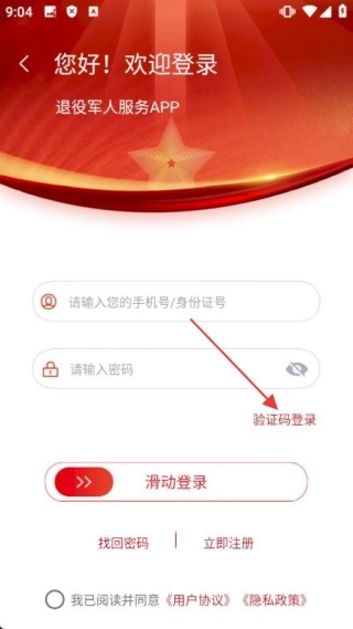 在退役军人服务的登录界面,找到并点击【验证码登录】选项,即可切换至验证码登录界面。