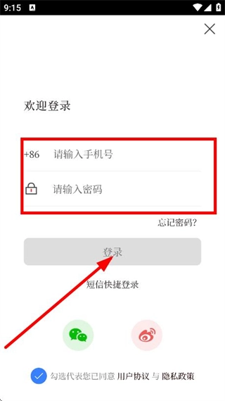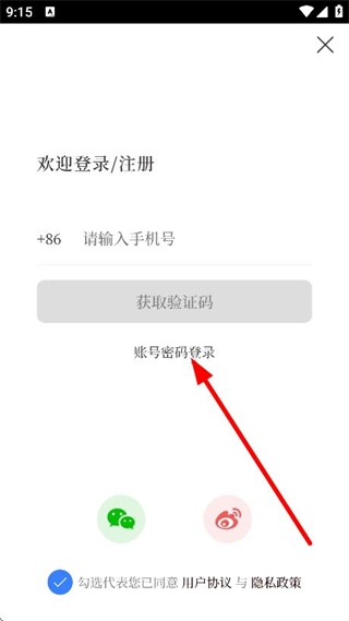 在账号密码登录页面,输入手机号码与密码后,点击登录按钮,即可完成登录流程。