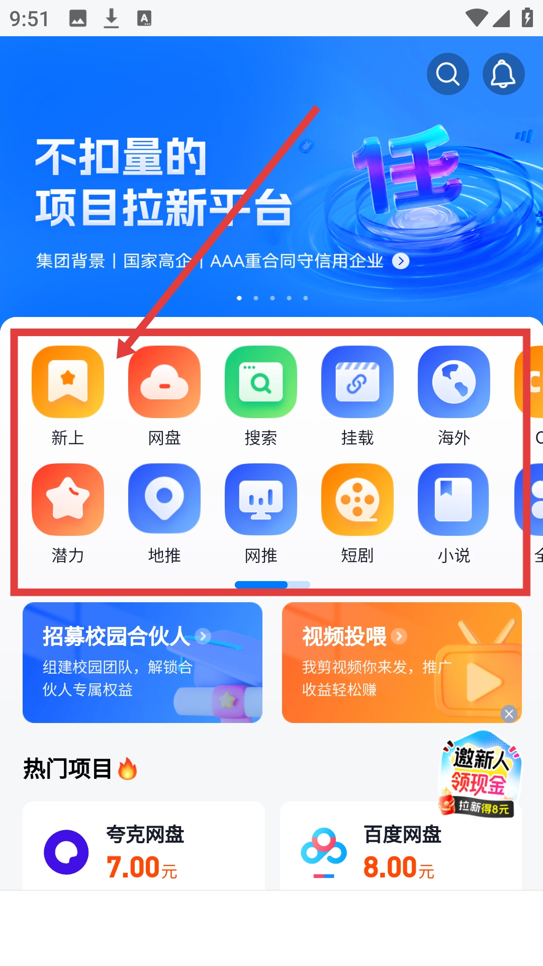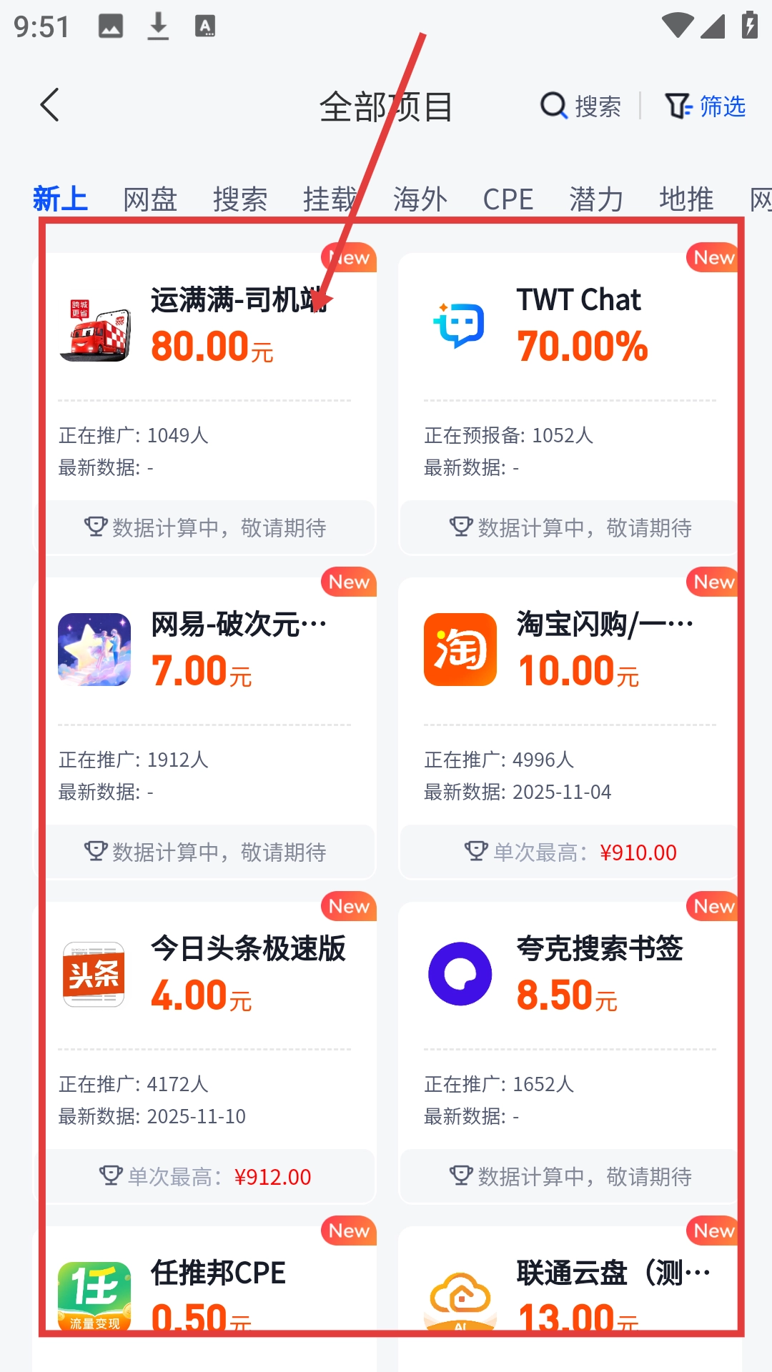 在软件首页找到【新上】分类并点击,就能进入新上项目列表页面,浏览最新的推广项目了。