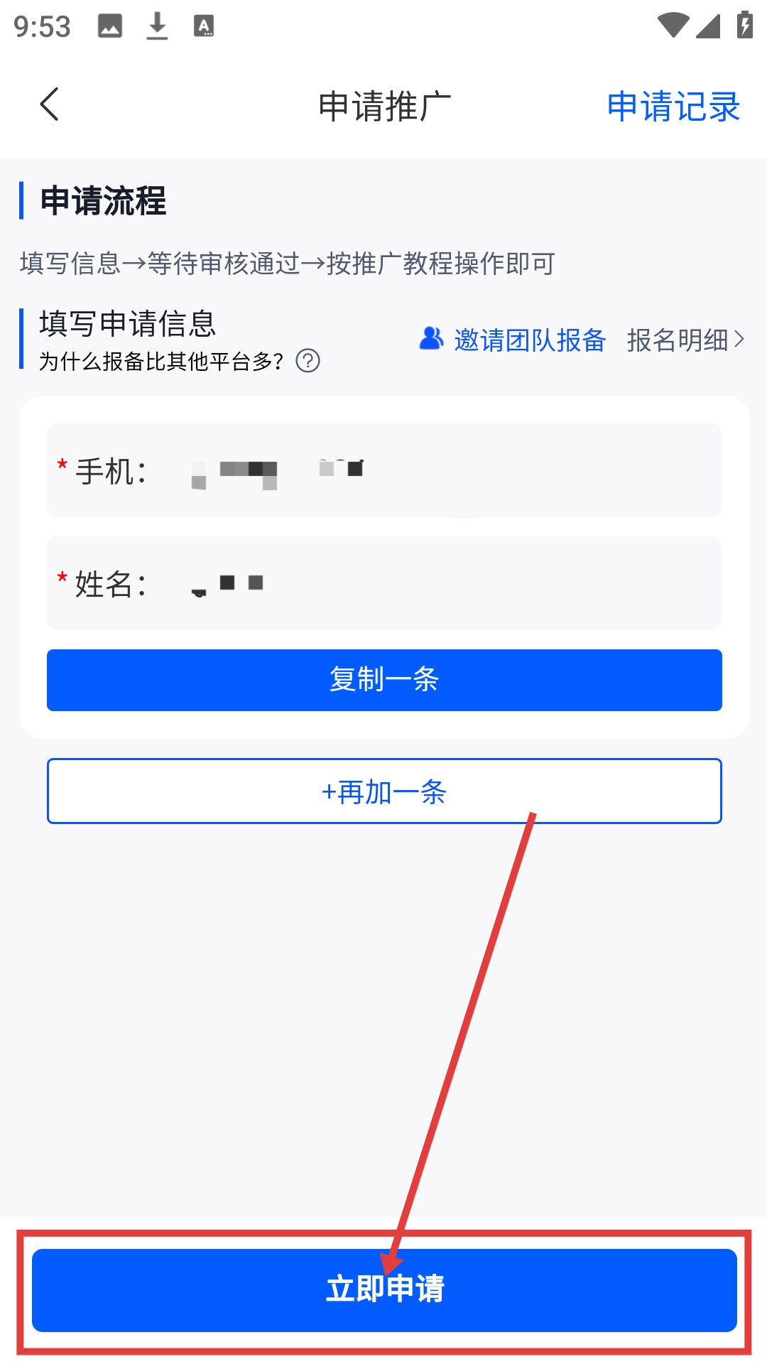 在推广申请页面,填写手机号、姓名等必要信息后,点击【立即申请】按钮,就能提交你的推广申请啦。等审核通过,你就可以开始做推广赚收益了哦。