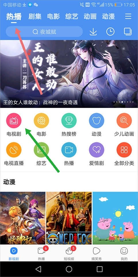 还有一种方法是把顶部分页导航栏切换到【电视直播】区域(即下图绿色箭头指向的地方),这样用户就能看到各大地方卫视正在热播的电视剧了。