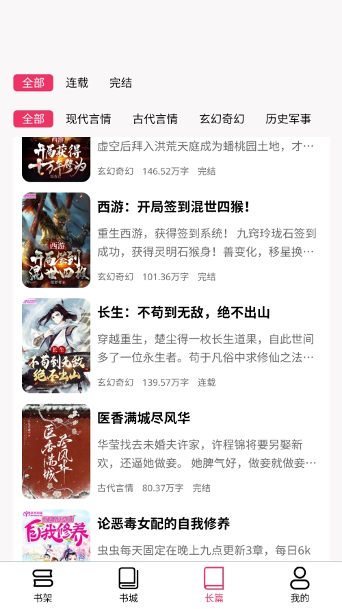 书城涵盖了种类繁多的书籍小说,像最新上架的作品、高分优质佳作、全站精选好书以及长篇专区等类别都有,大家可以在这里寻找自己感兴趣的书籍小说。
