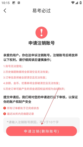在账号注销申请页面,仔细阅读注销带来的后果说明,填写注销原因后,点击【申请注销(删除账号)】按钮即可完成该操作。