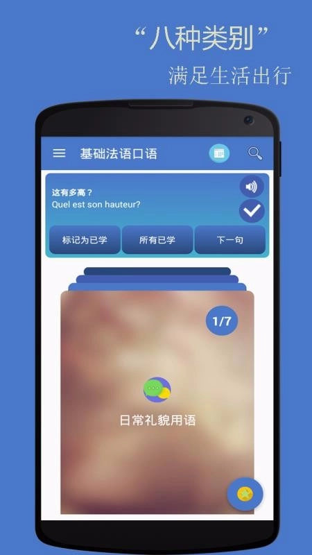 应用程序设有内容丰富的类别学习区,为用户提供了八个不同的法语学习类别板块。