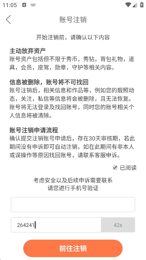 填写手机号码后,输入收到的验证码,最后点击【前往注销】按钮就可以了
