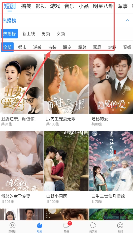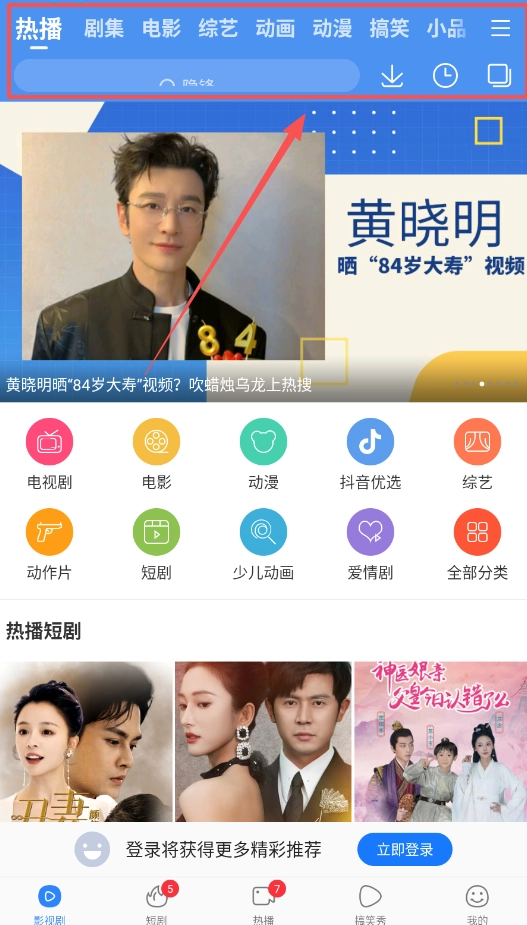 若想观看短剧或影视内容,可在首页点击“看剧”页签,页面上方设有关注、推荐、短剧、竖屏、热点等分类标签,方便您进行内容筛选。