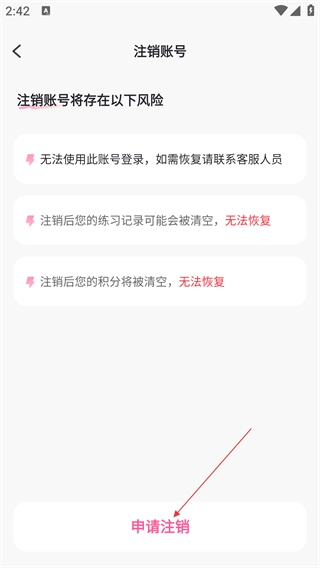 在账号注销页面,确认风险提示内容后,点击【申请注销】按钮。
