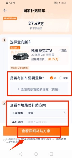 选择新车并填写置换信息,查看详细补贴方案。