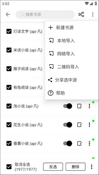 全选勾选后就等于启用了书源,要是还想导入大神分享的书源,点击右上角的按钮就行。