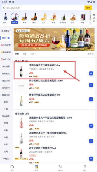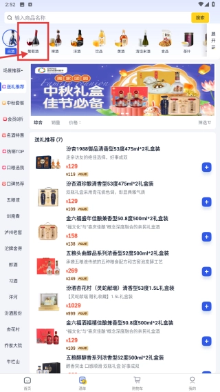 在分类页面,选择红酒类别,进入红酒商品列表页面。
