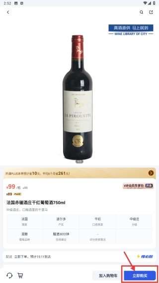 挑选法国赤露珠酒庄的750ml干红葡萄酒商品项,进入该商品的详情页面。