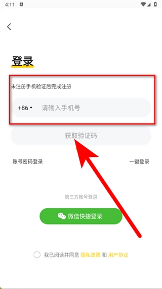 在登录界面,输入手机号码,勾选相关选项后,点击“获取验证码”按钮。