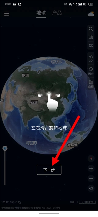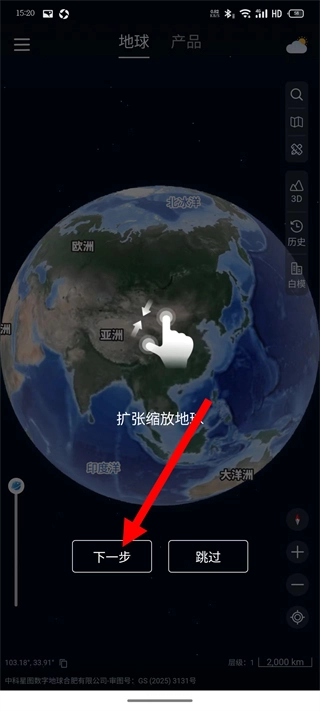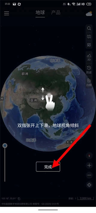 试着用双指张开的手势上下滑动屏幕,等地球视角出现倾斜效果后,点击“完成”按钮,这样就能结束新手引导环节,正式开启探索之旅了。