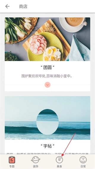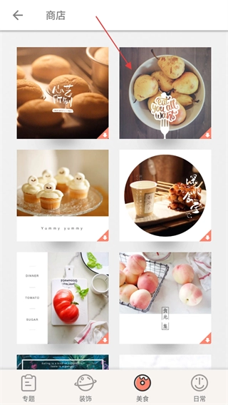 在商店页面,点击底部的美食分类,查看美食相关的模板等内容。