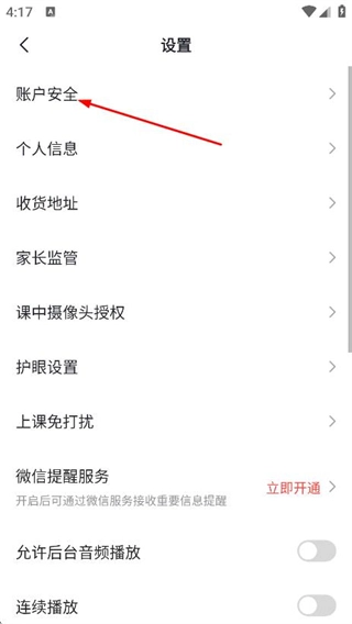 在设置页面,点击账户安全,进入账户与安全页面。