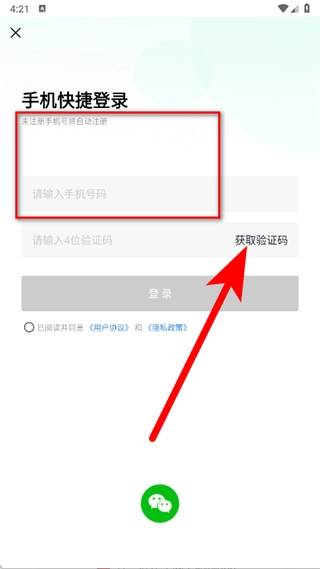 在手机快捷登录界面,输入手机号后,点击“获取验证码”按钮。