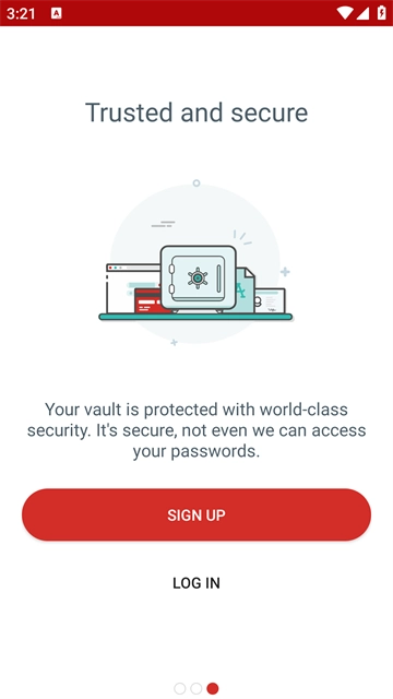 接着打开软件并选择登录或注册操作:打开LastPass,进入界面后,要是已经有账号,就点击“log in”进行登录;如果还没有账号,那么点击上方的“sign up”按钮。