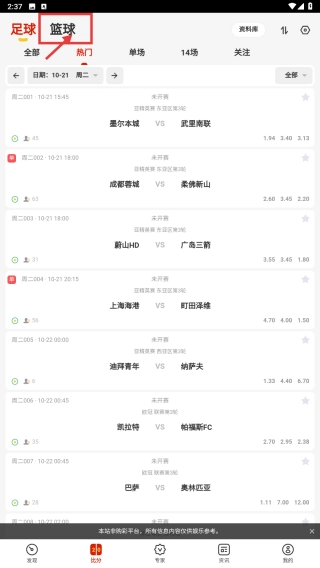 在足篮赛事页面,点击篮球选项,进入篮球赛事列表。