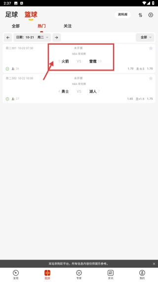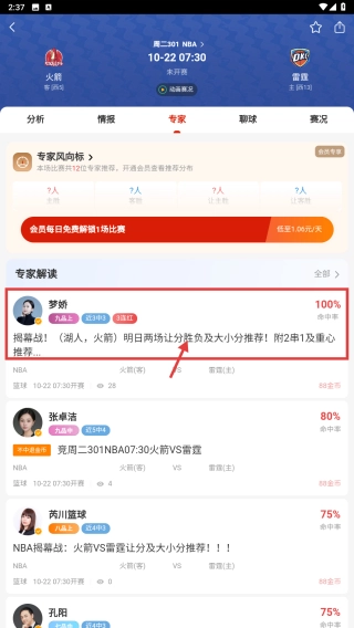 在赛事详情页面,能查看专家解读,像罗娇对火箭前两日两场让分胜负与大小分的分析推荐!其中还附有2串1及重心推荐,大家可依据专家建议来了解赛事分析。