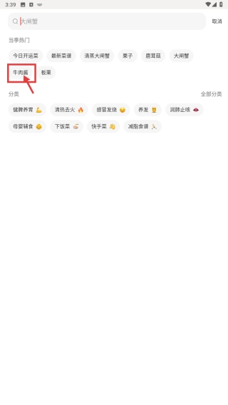 打开美食类应用,在顶部搜索栏输入大闸蟹,进入搜索结果页面。