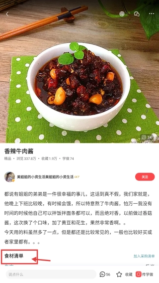 在笔记详情页查看食材清单,就能获取制作香辣牛肉酱所需的食材信息,方便开展烹饪准备工作。