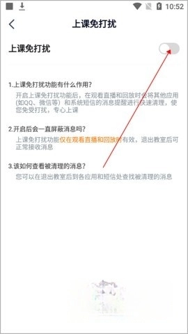 进入上课免打扰界面,点击旁边的按钮开启它。