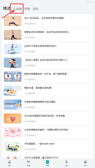 在发现页面,找到并点击心血管相关选项,即可进入心血管健康研究的内容列表页面。