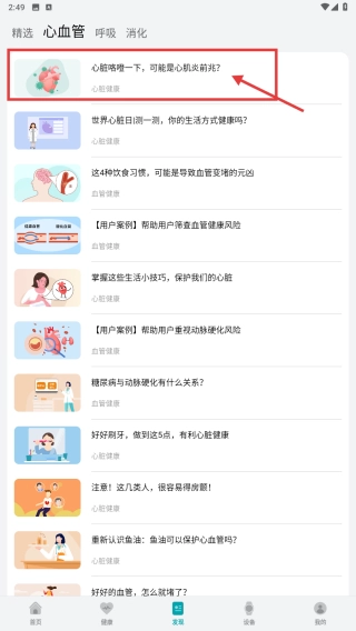 在心血管健康研究的内容列表里,挑选你感兴趣的文章,像“心脏咯噔一下,或许是心肌炎的前兆?”这类的,然后点击进入文章的详情页面。