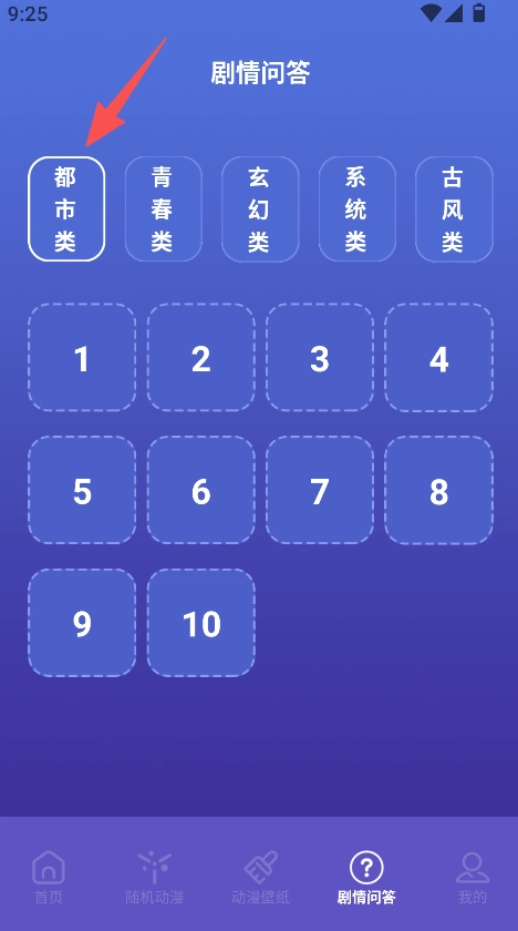 进入剧情问答板块,挑选都市类等目标类别,再进入答题界面。