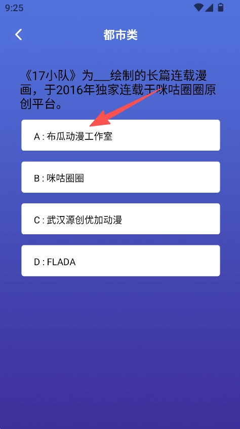 在答题界面中,挑选题目对应的选项,来参与动漫剧情相关的问答互动环节。