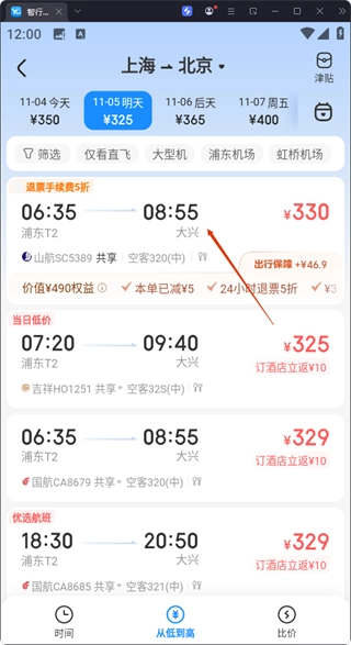 在首页选定出发地、目的地与出行日期后,点击【机票查询】按钮,就能查看相关航班信息。